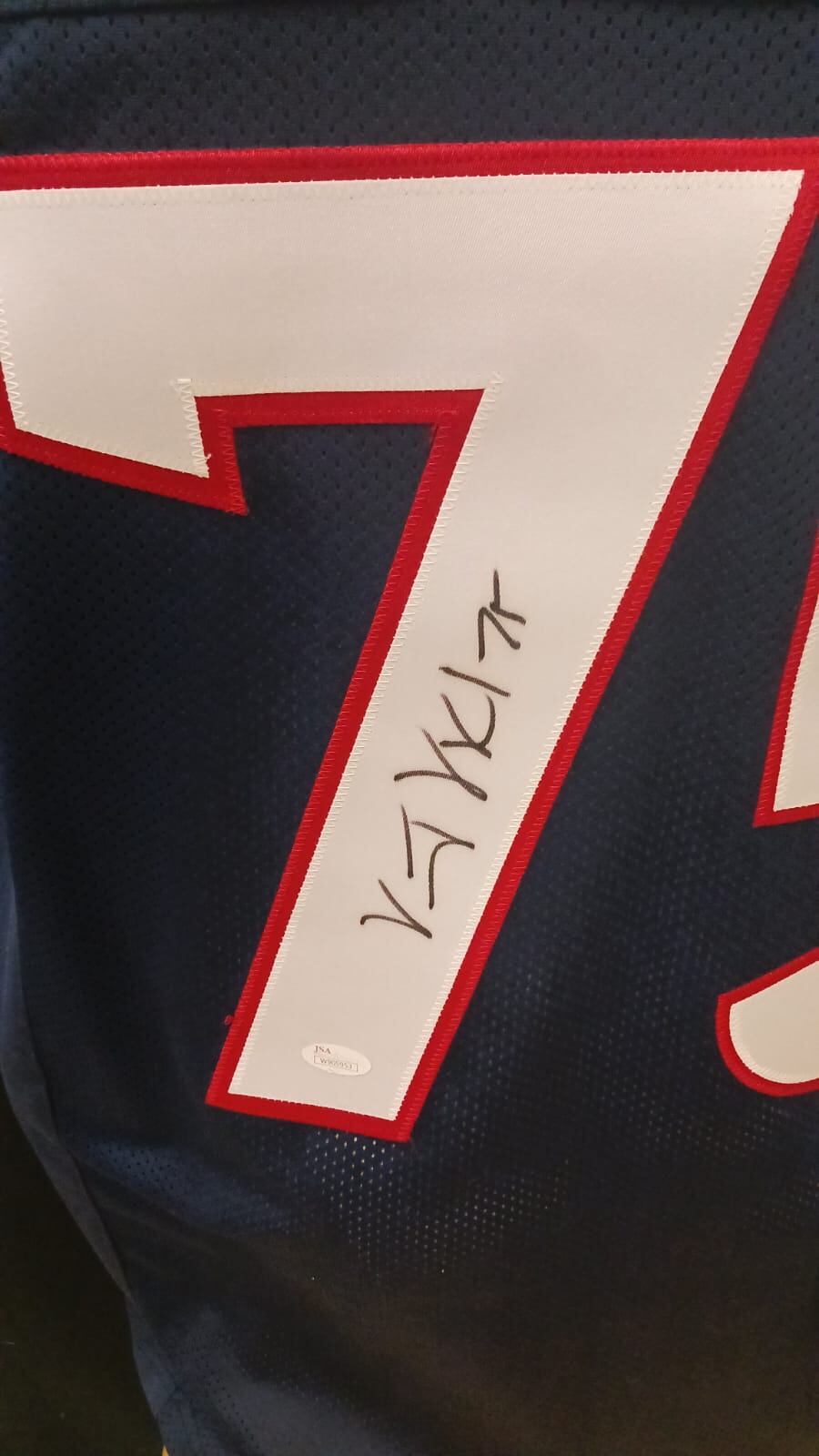 Vince Wilfork Autographed jersey … this is a custom jersey with stitched on letters and numbers. It comes with a JSA witnessed certificate of authenticity … size Men's XL