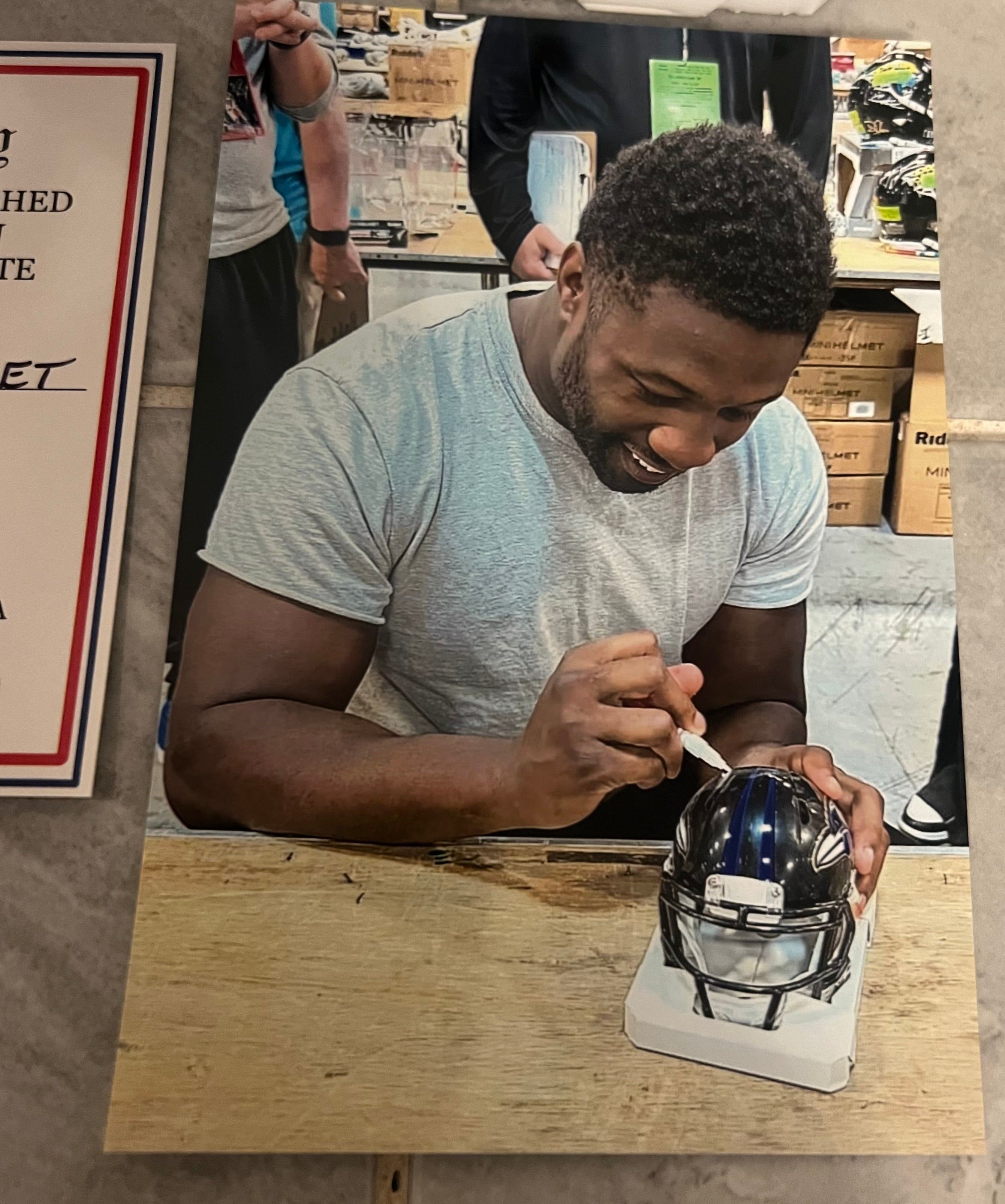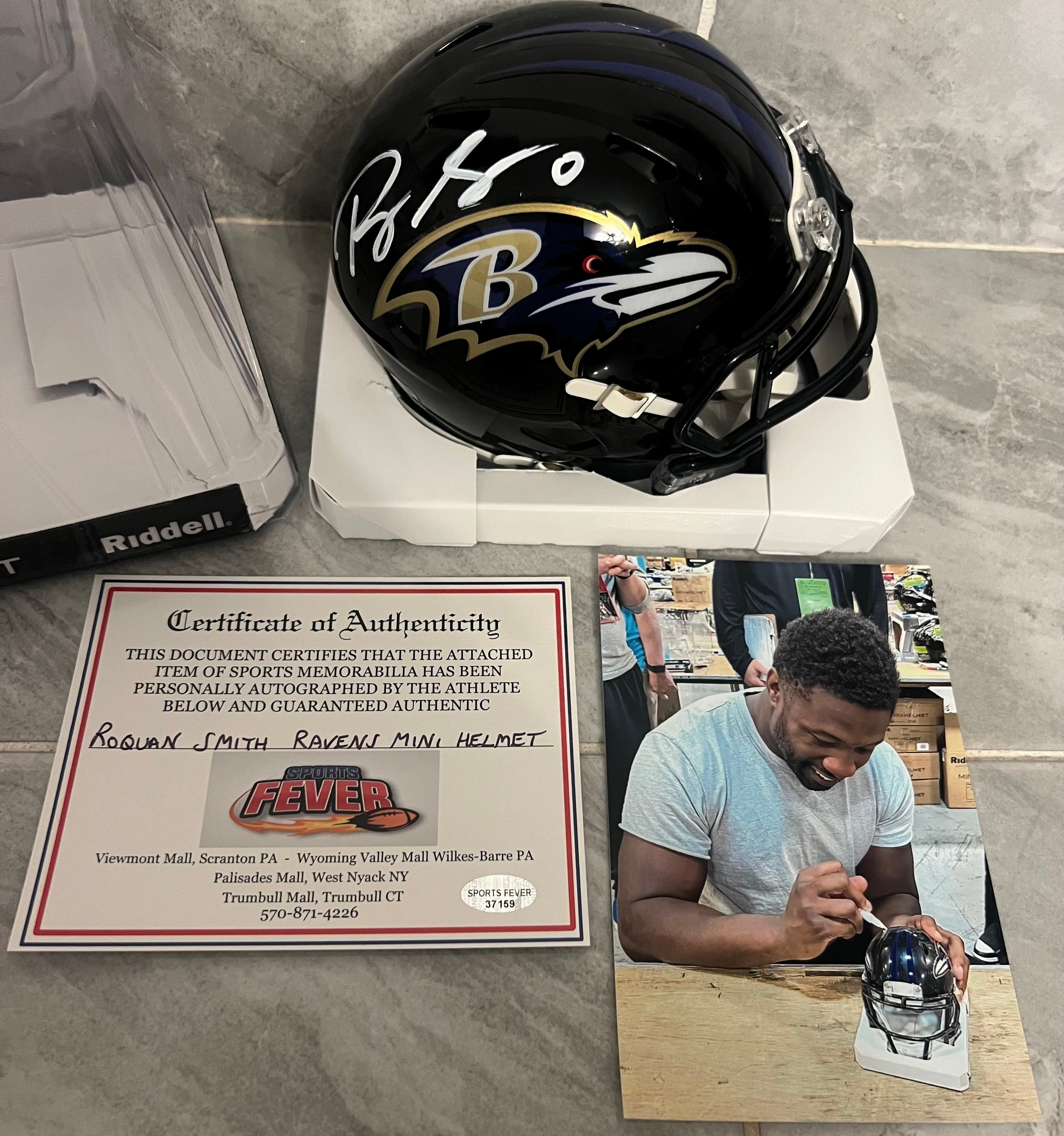 Roquan Smith autographed Baltimore Ravens mini helmet with Sports Fever COA… You will also receive a 4x6 photo from the signing. This is a hand signed standard size Riddell Mini helmet. ?This comes in perfect condition (new in the box)
