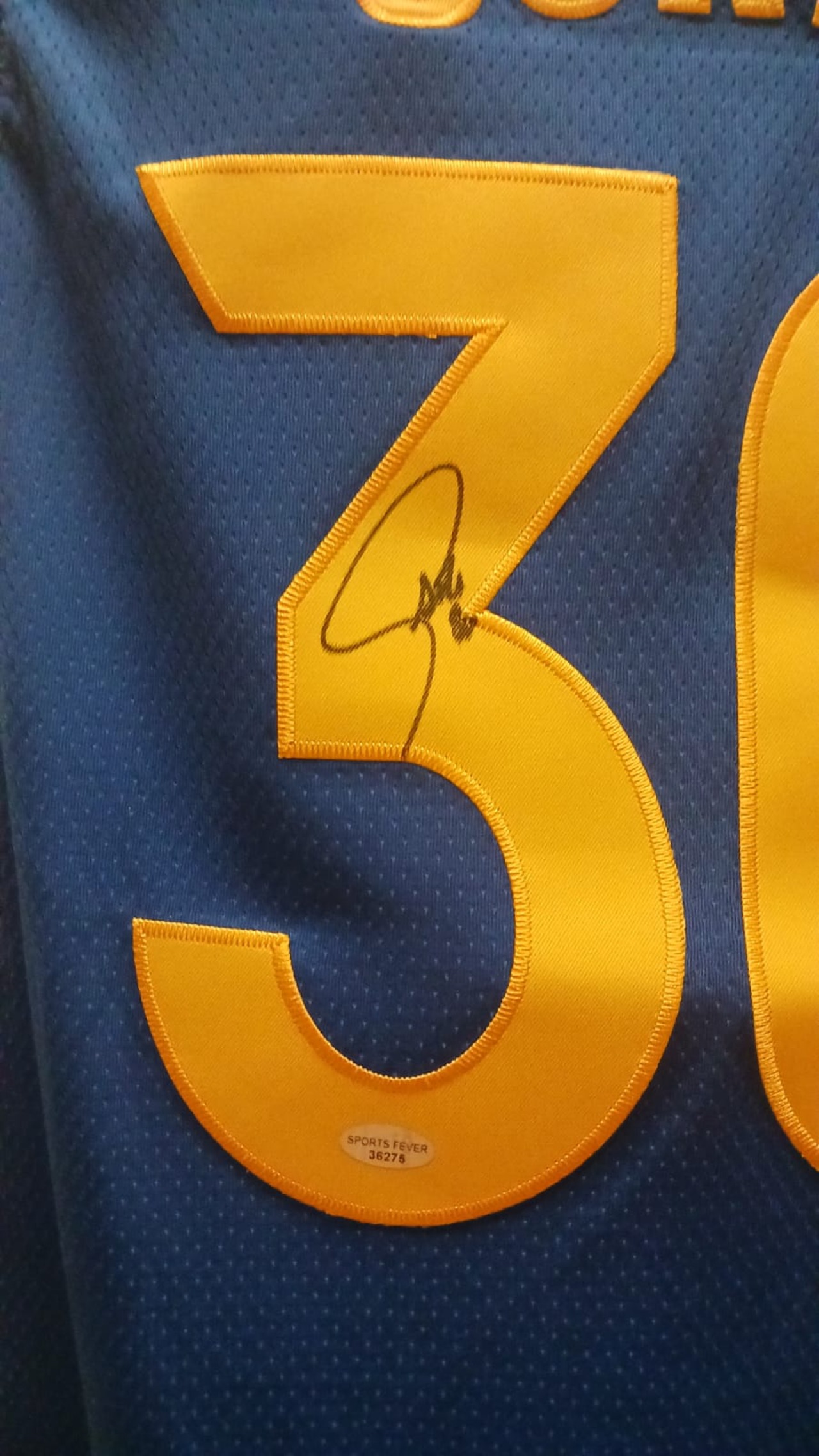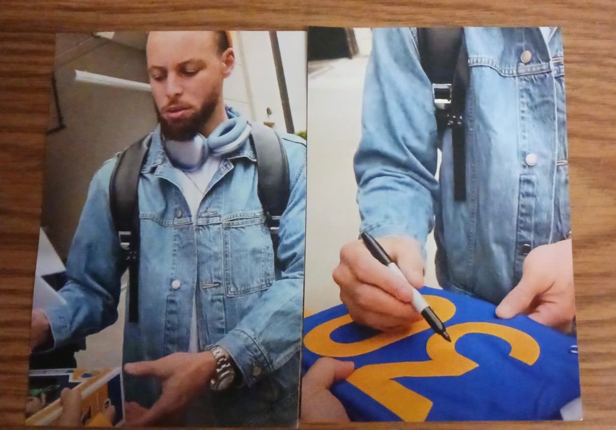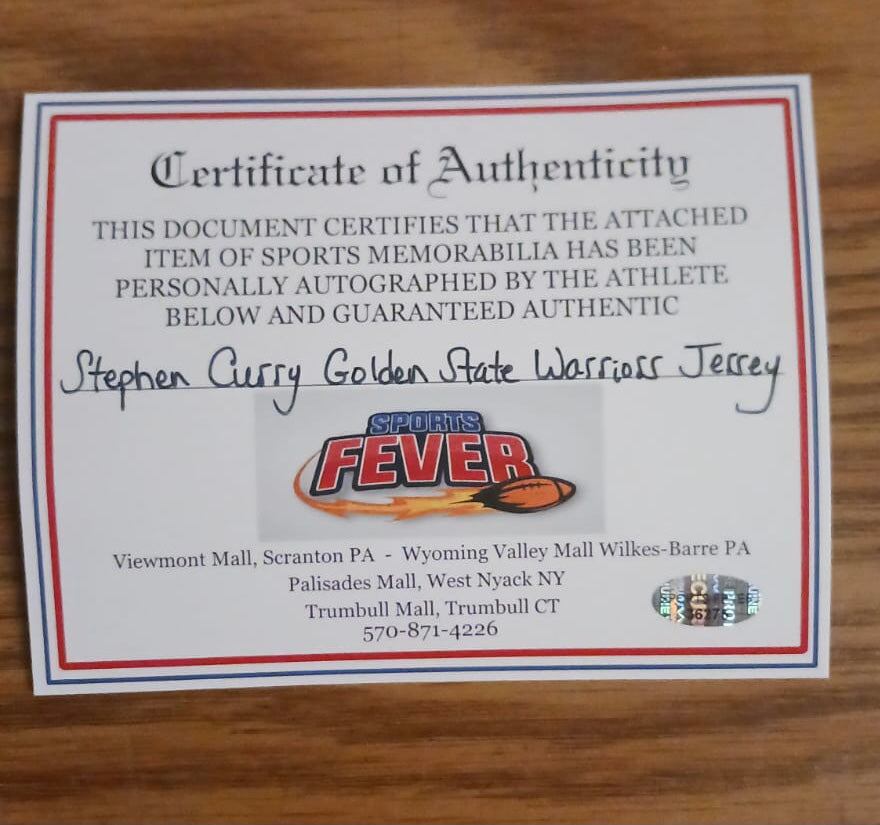 Stephen Curry autographed Golden State Warriors jersey… This jersey is hand signed and comes with a certificate of authenticity from Sports Fever. You will also receive the two 4x6 photos of him signing the jersey. It is made by Nike and has stitched on letters and numbers. The jersey is Men's size XL